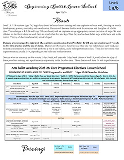 Ages 7-9/10 Beginners we recommend begin in level 1b, 2x a week! Any student age 7+ who is new to ballet or who has taken in our young dancer's program should consider starting the primary training in level 1b 2x a week. If you cannot attend 2x/week, then please consider our Elementary ballet 1A option, or the pre-teen/teen beginner class ages 10-14.